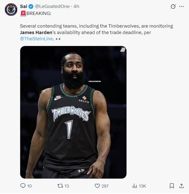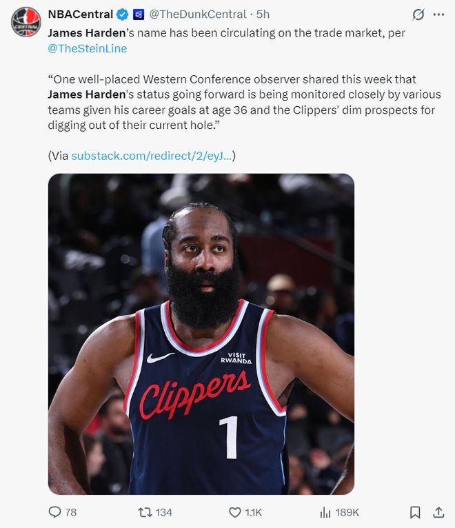 北京时间12月19日,NBA名记马克-斯坦恩透露,一位匿名的西部高管称詹姆斯-哈登的名字已经频繁的出现在交易市场上,考虑到36岁的哈登还在寻求个人生涯向上的目标,快船队目前陷入泥沼难以摆脱困境,多支球队都在密切关注哈登的动向。