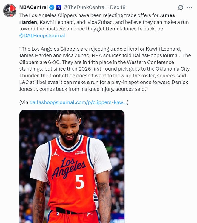 一天之前美媒Hoops的说法是快船拒绝交易祖巴茨、哈登、伦纳德、德里克-琼斯等人,他们觉得等到琼斯复出后快船再进行一些小的修补又会成为西部顶级的球队。这一天过去差距就如此之大?
