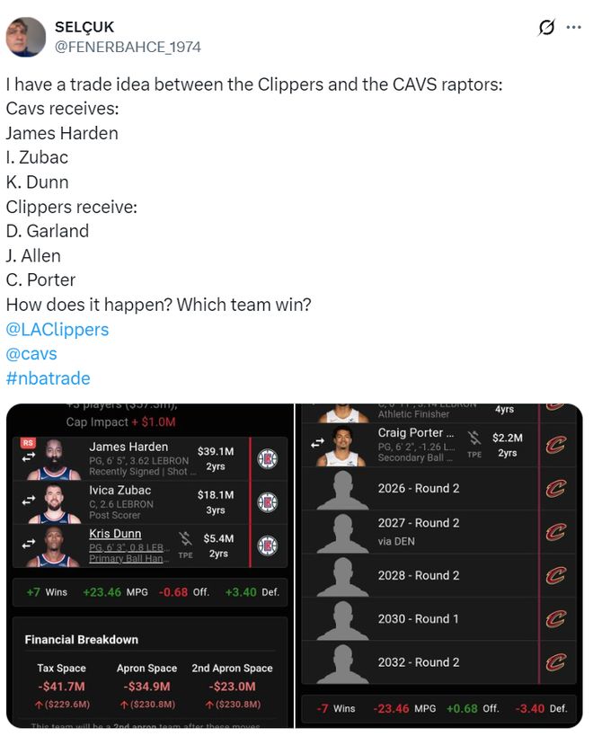美球迷为骑士、快船模拟了一套方案,这套方案是8换2,两队的阵容进行了一个巨大的改善: