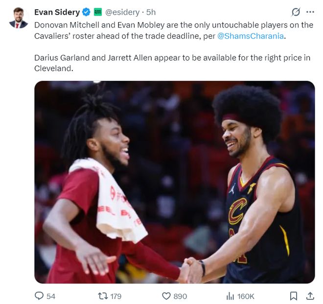 NBA记者埃文-斯迪瑞也透露,骑士队本赛季前28场比赛已经输掉13场,而上赛季他们在三月份才输13场比赛,骑士队的表现远低于预期,球队中只有米切尔、莫布利是非卖品,加兰、阿伦等人都已经在货架之上,骑士也想通过交易来拯救赛季。